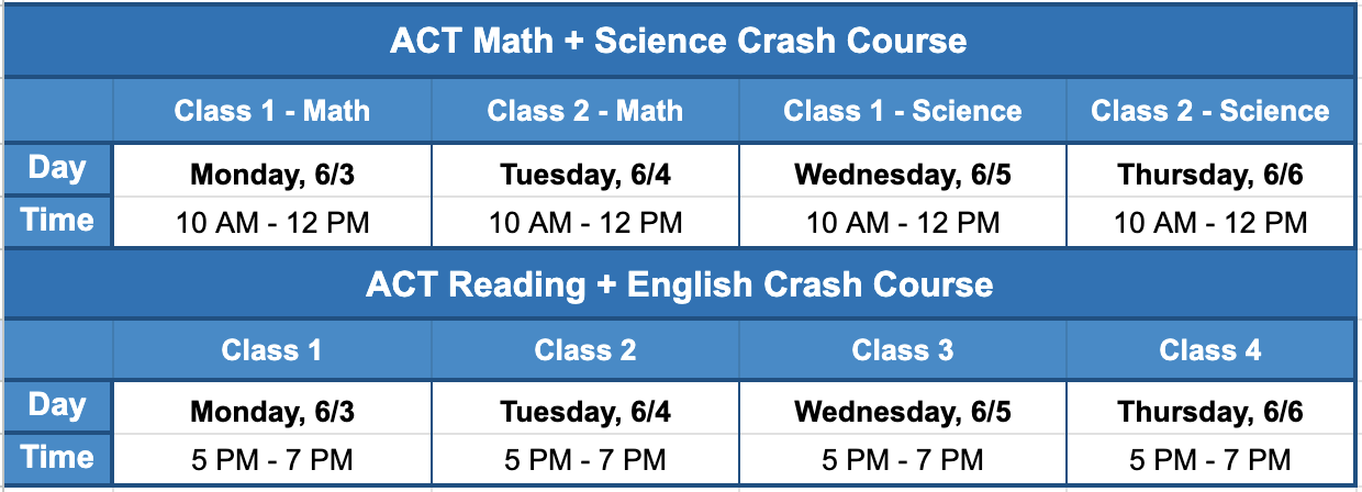 Our ACT Crash Course is designed to introduce strategy, timing, and to cover actual ACT questions to prepare your student for the upcoming June 8th ACT!