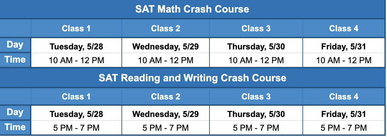 Our SAT Crash Course is designed to introduce strategy, timing, and to cover actual SAT questions to prepare your student for the upcoming June 1st SAT!